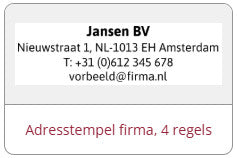 Afhankelijk van het gebruik kan de stempel minimalistisch zijn (alleen bedrijfsnaam en adres) of uitgebreid (inclusief belastingnummer, bankgegevens, enz.). Een bedrijfslogo zorgt voor een professionele uitstraling!